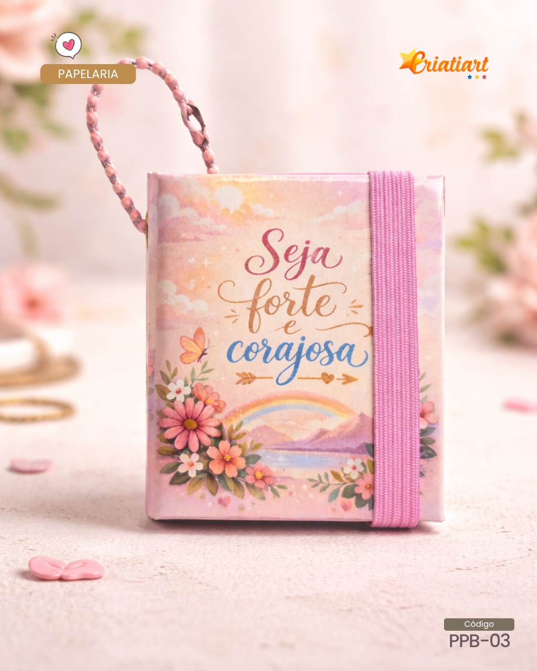O modelo Nicolinha encanta com seu design delicado em tons suaves, detalhes florais e a mensagem inspiradora que traz leveza e motivação para o dia a dia.